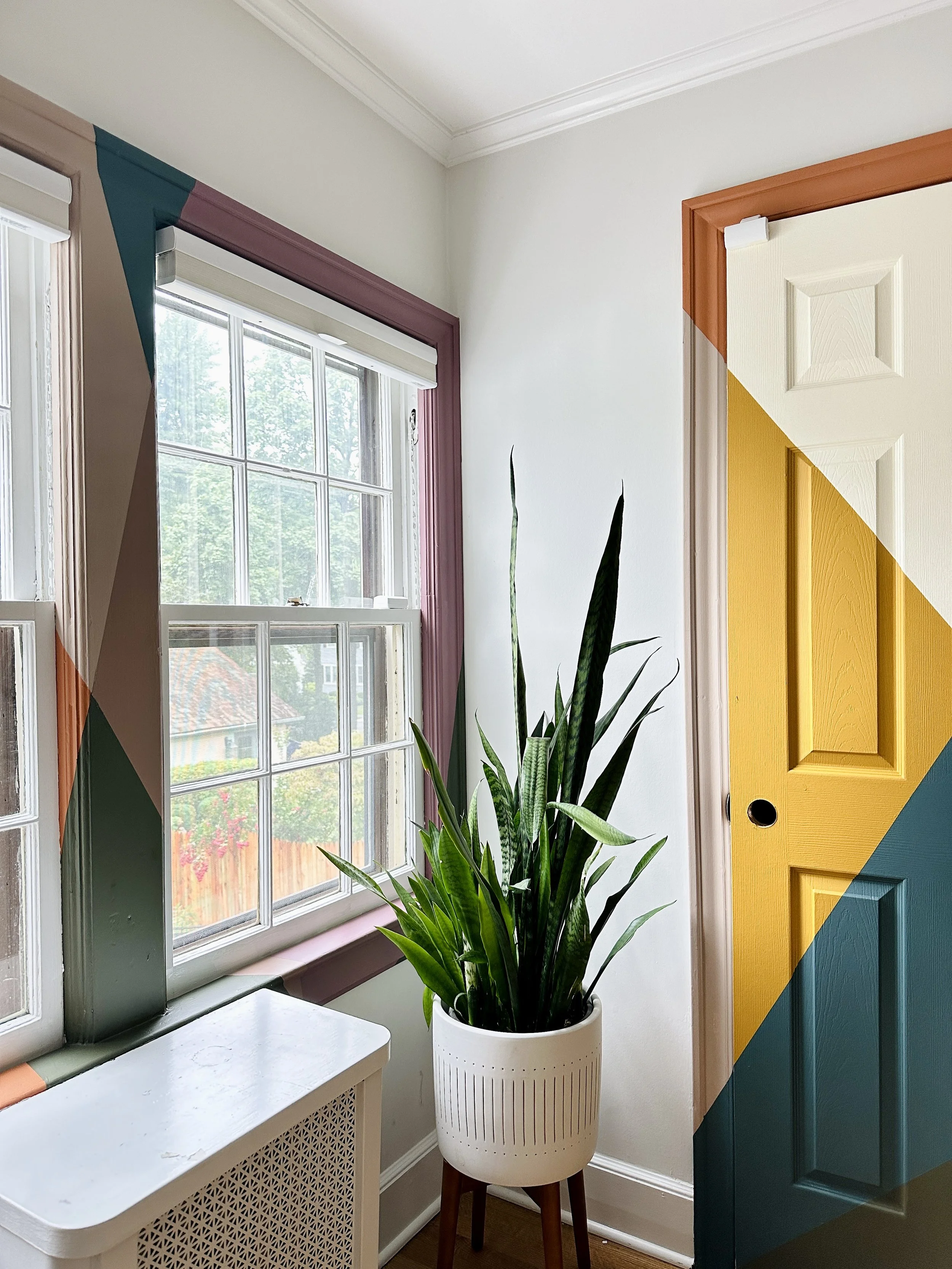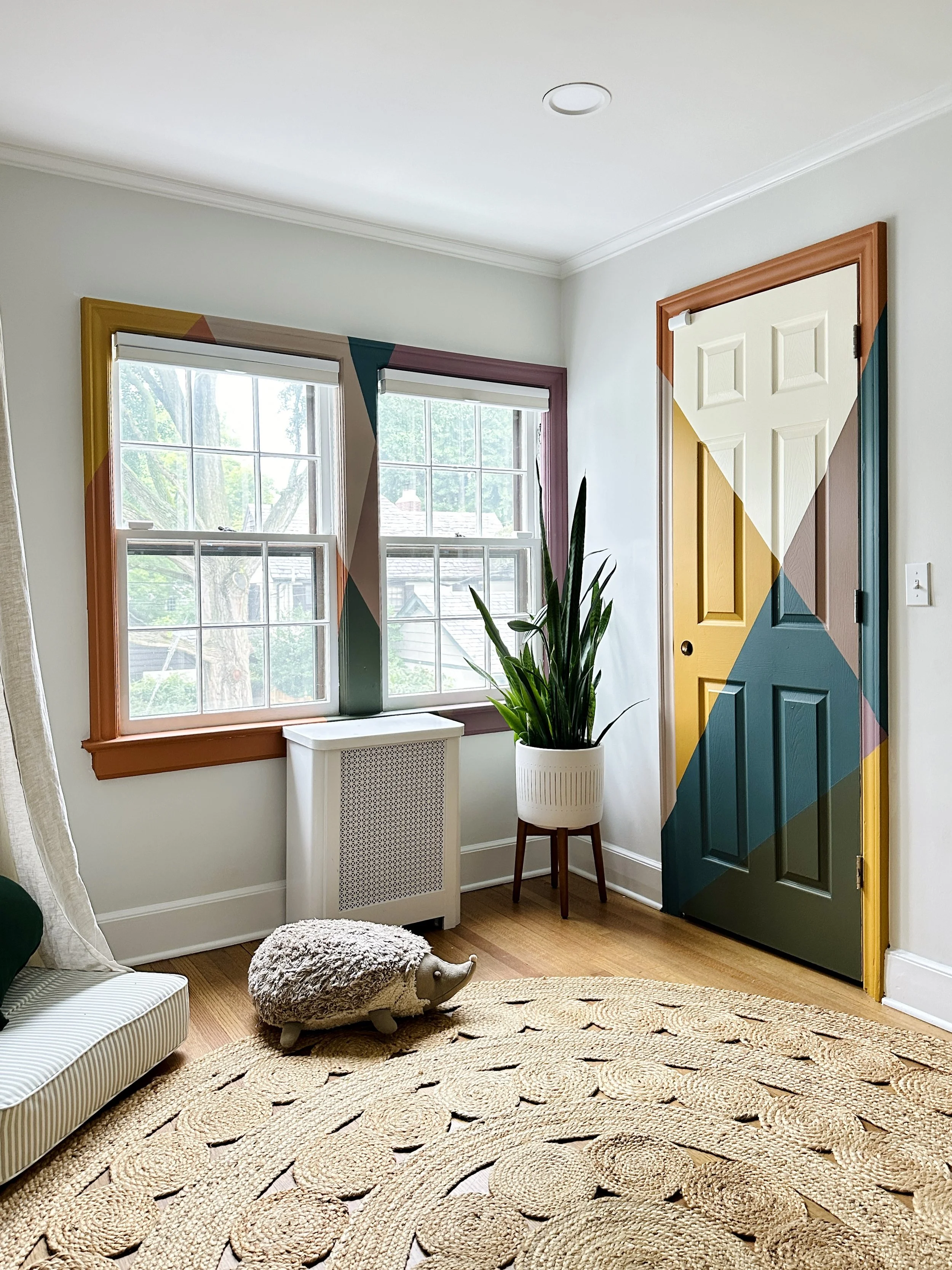 The second mural that we’ve done in this home! The home owners wanted a cosy place for their new babe. We took jeweled earth tones with pops of pink to the walls, window frame and closet door.