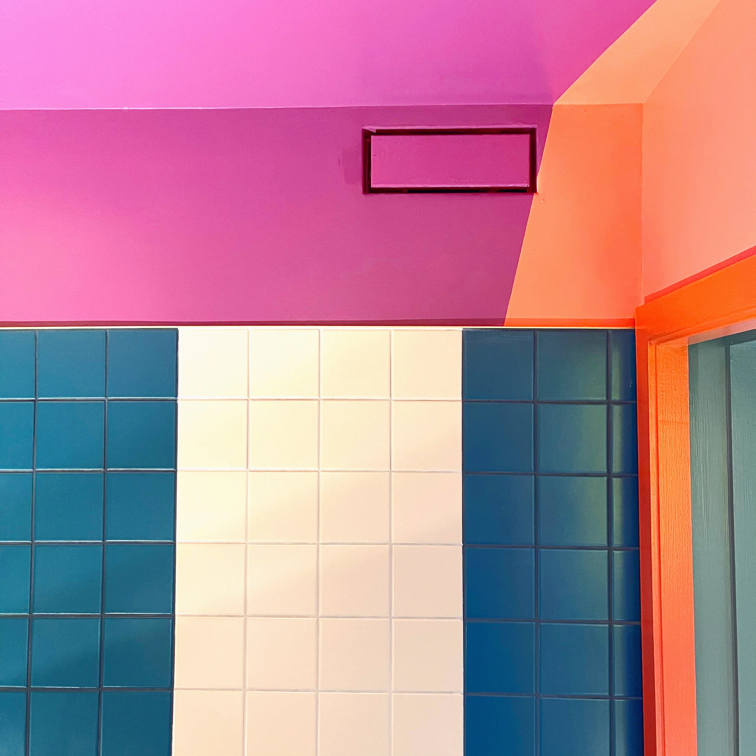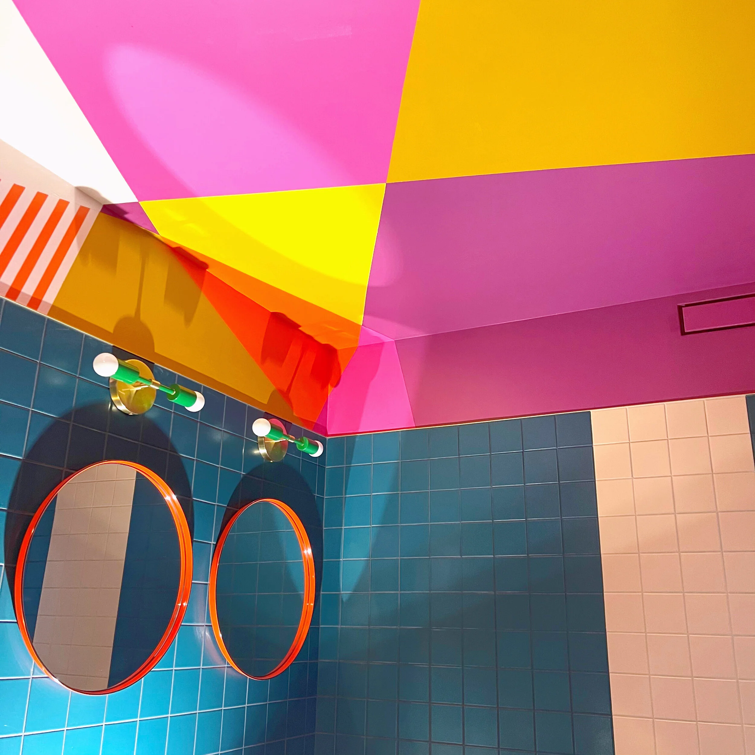 This Master Bathroom really packs a punch@ A colorful combination of pinks, purples, oranges and mustard work together to create a burst of magic behind the inconspicuous pocket door. This room has no natural light of its own so bringing color to the ceiling really helps to brighten the space.